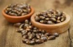 Castor bean features reddish-brown seed capsules and large, glossy green leaves with five to 11 pointed lobes like fingers on an open hand. Some varieties sport attractive bronze or burgundy foliage. Given the showy nature of its other aspects, the fact that castor bean has small, dull flowers may come as a surprise.